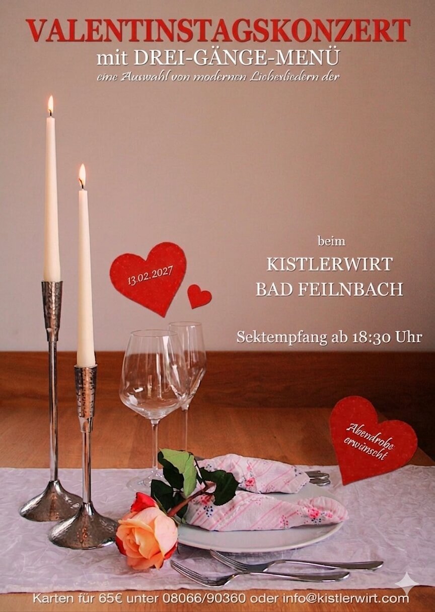 Valentinskonzert mit 3-Gänge Menü im Kistlerwirt Freuen Sie sich auf einen ganz besonderen Abend zum Valentinstag am 13. Februar 2027 im gemütlichen Kistlerwirt in Bad Feilnbach! Es erwartet Sie ein stimmungsvolles Konzert mit einer liebevoll ausgewählten Auswahl moderner Liebeslieder der Zeitlang-Musi & Gsang, die garantiert Herz und Seele berühren. Dazu servieren wir Ihnen ein delikates Drei-Gänge-Menü, welches den Abend kulinarisch perfekt abrundet. Für einen stilvollen Start